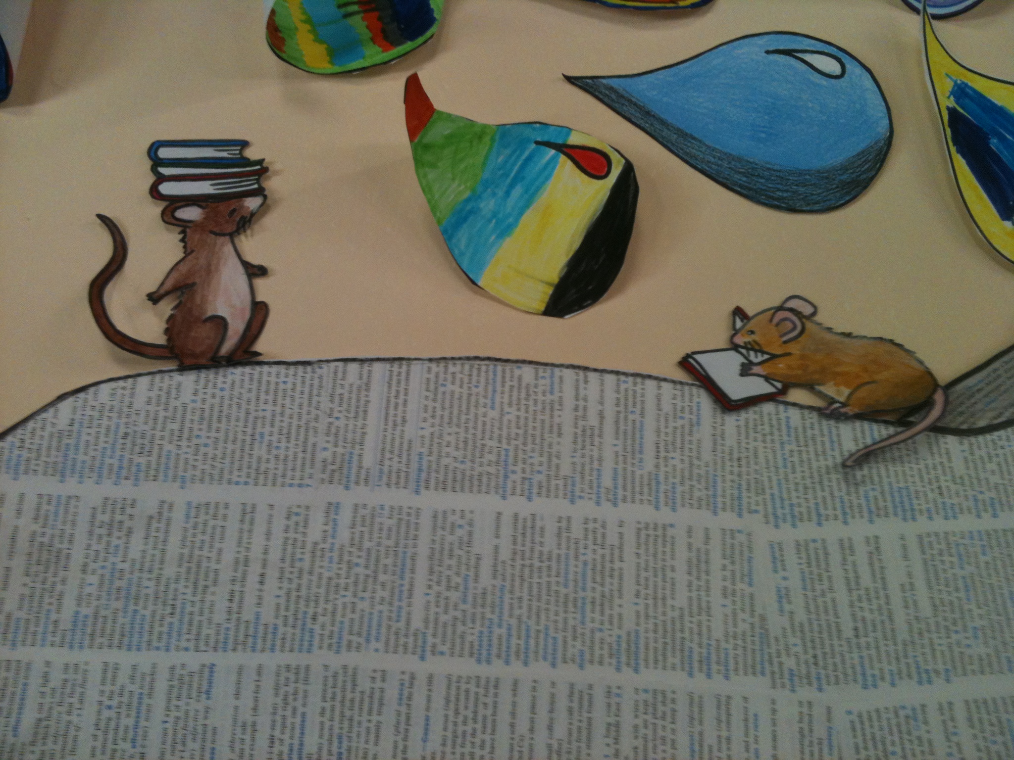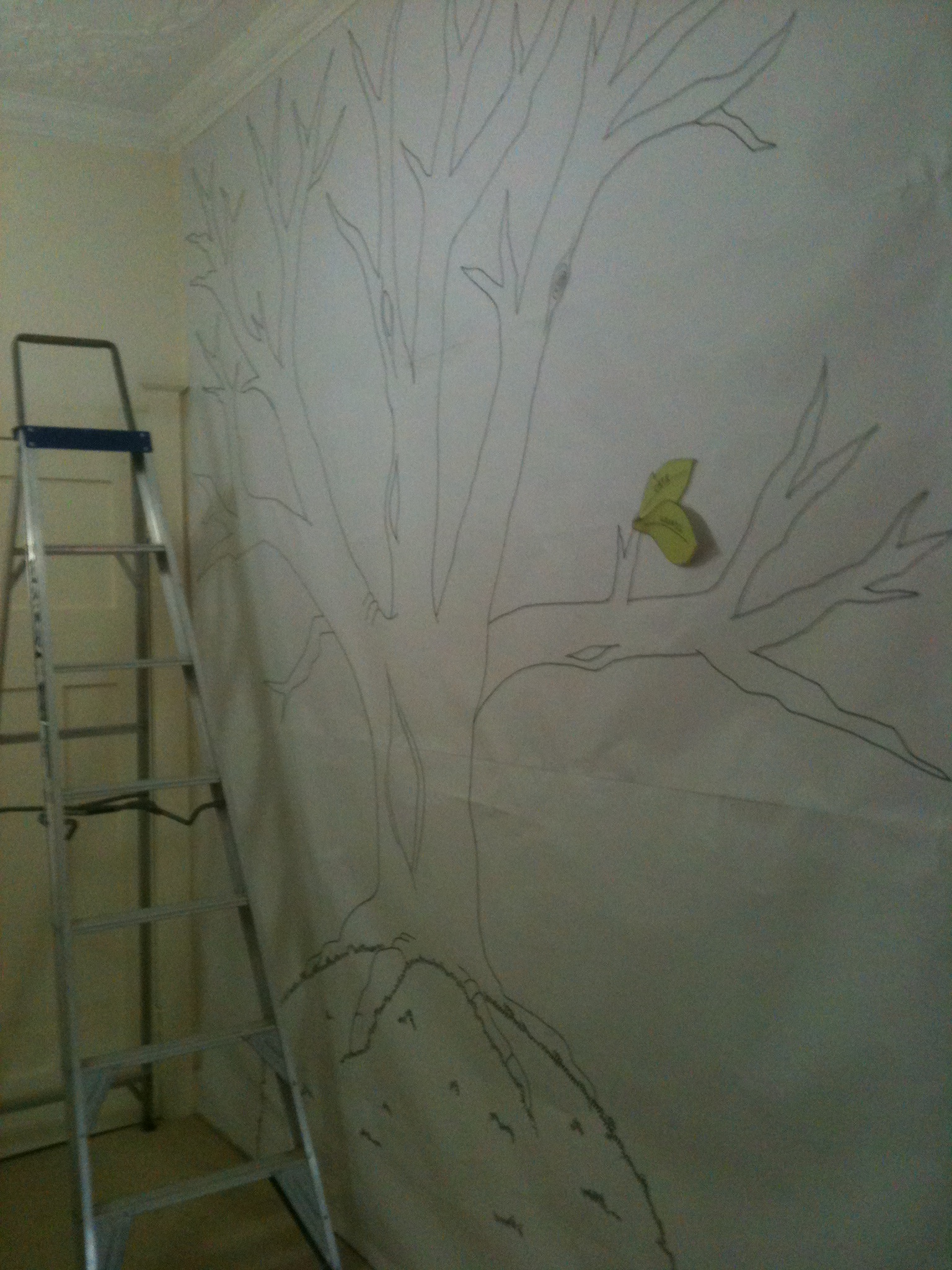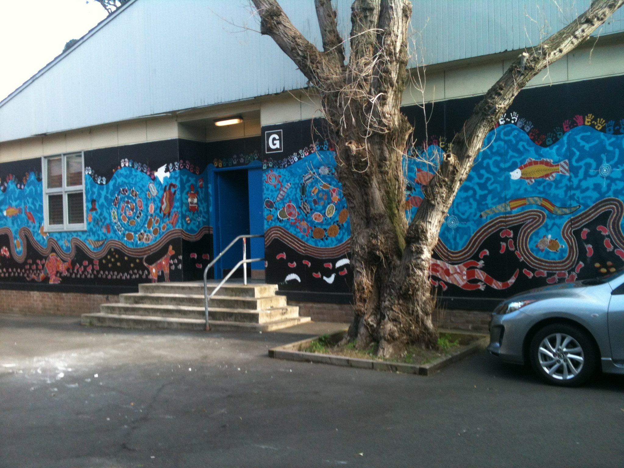 I really like the fruit and vegetables we painted within the lettering, but in retrospect I think the bees buzzing around may be a little too suggestive of flies (or is that just me?). I also think the lettering is a trifle too large, and I regret not having painted the background. Overall though, it’s a big improvement, and the colours fit in nicely with the existing rainbow painting and the murals we painted on the nearby columns.