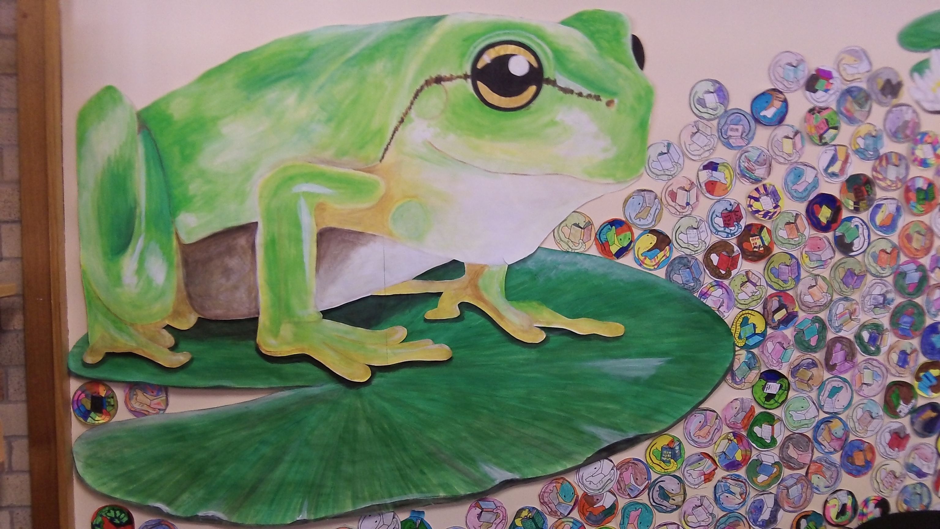 This display gradually grew and developed over 8 weeks. Initially I painted just a large green frog, then I added some reeds, a large lilypad, then some more lilypads with a waterlily, then a dragonfly. Meanwhile, the kids were adding tadpoles… and more tadpoles… and more tadpoles! Take a closer look below.
